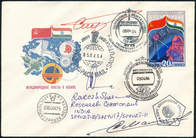 Jurij Malisev (1941-1999), Gennagyij Sztrekalov (1940-2004) szovjet és Rakesh Sharma (1949- ) indiai űrhajósok aláírásai emlékborítékon /
