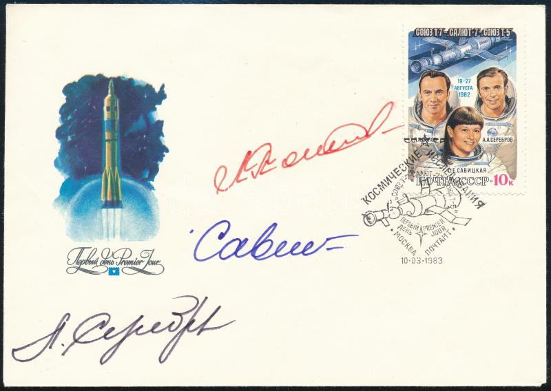 Szvetlana Szavickaja (1948-), Alekszandr Szerebrov (1944-2013) és Leonyid Popov (1945- ) orosz űrhajósok aláírásai emlékborítékon /