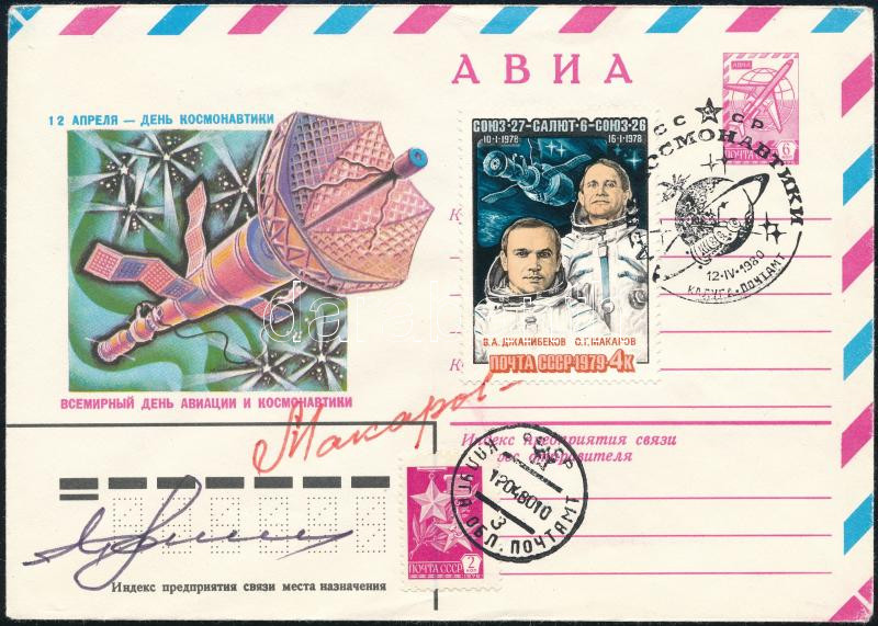 Vlagyimir Dzsanyibekov (1942- ) és Oleg Makarov (1933-2003) szovjet űrhajósok aláírásai emlékborítékon /