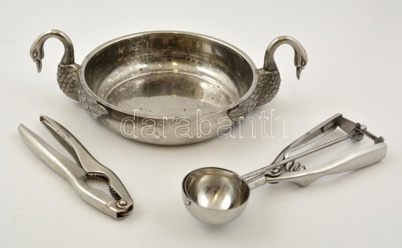 Leírás: Fagylatos kanál, hattyús tál, diótörő, h:15, 21 cm, 27×18 cm