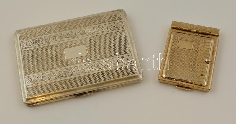 Leírás: Fém cigarettatárca + mini névjegyzéktartó, 11x8 és 7x5 cm