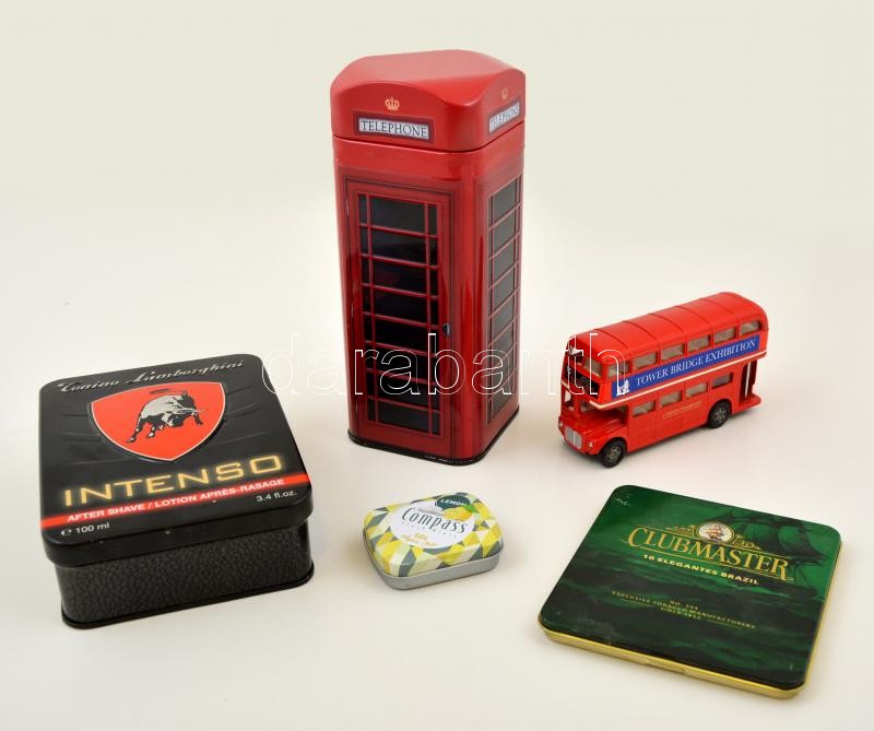 Leírás: Fém dobozok (4 db), 6×5-20×8 cm, londoni fém busz h:11 cm