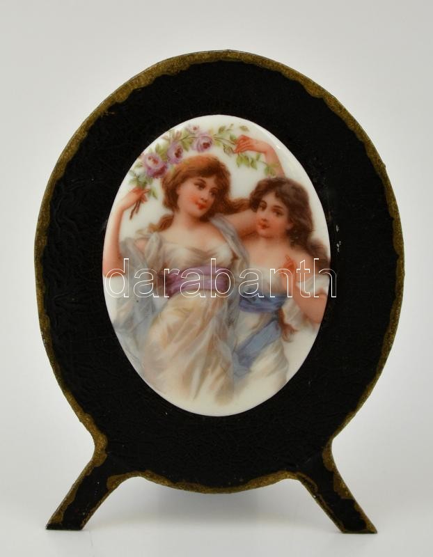 Leírás: Fém keretes porcelán asztali dísz, matricás, jelzés nélkül, kopásnyomokkal, m: 11,5 cm