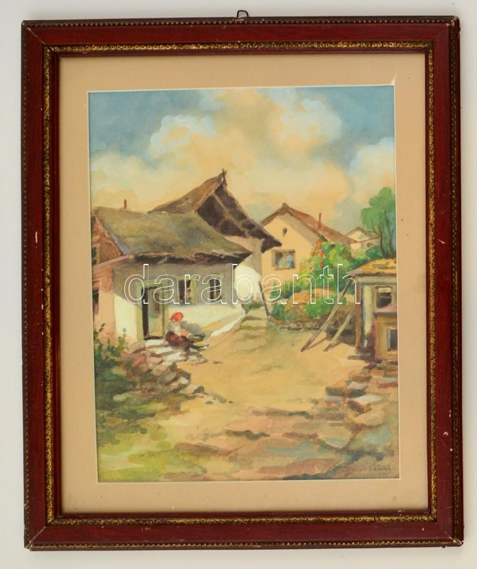 Leírás: Wágner jelzéssel: Házudvar. Akvarell, papír, üvegezett keretben, 29×23 cm