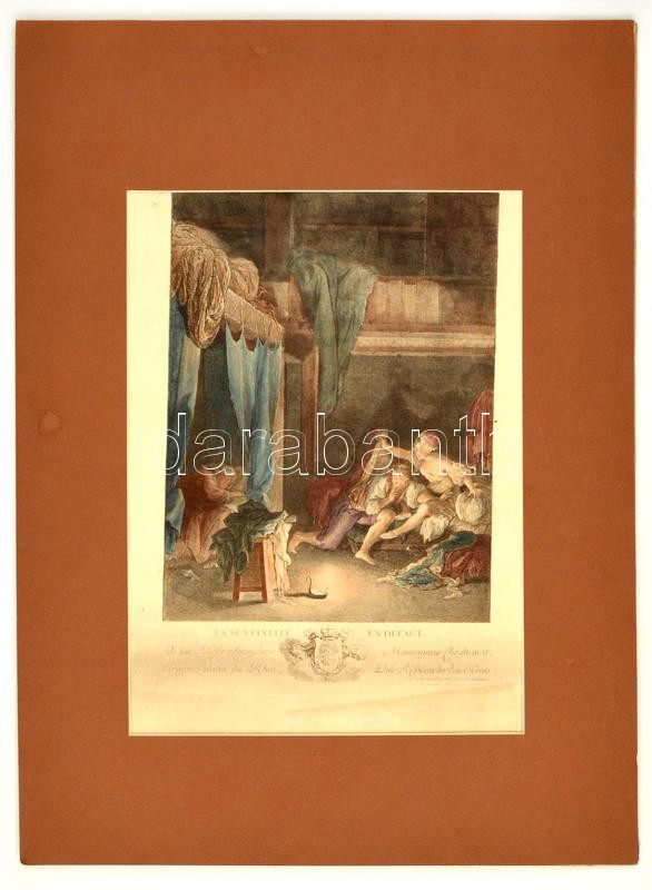 Leírás: cca 1880 La sentinelle en defaut, színezett rézmetszet, paszpartuban, 41×30 cm