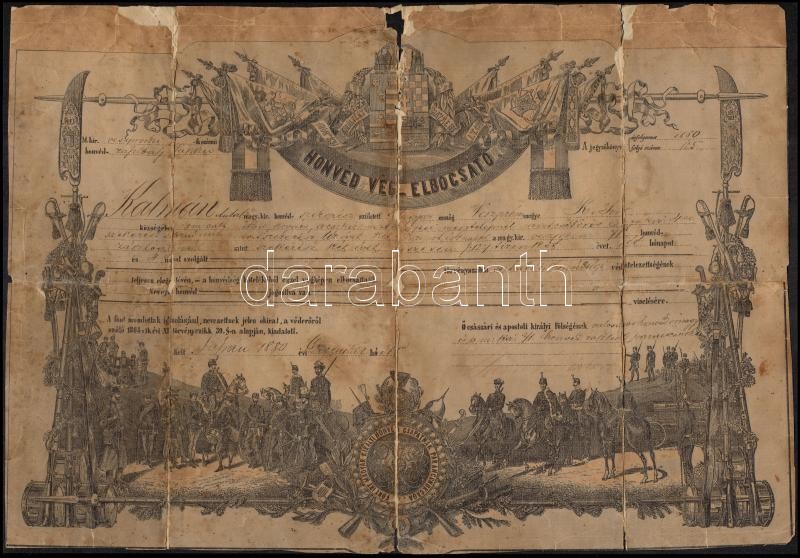 1880 Honvéd végelbocsájtó levél (obsit) veszprémi 71. honvéd zászlóalj... https://www.darabanth.com/hu/292-Gyorsarveres/292.0/Festmeny-mutargy-papirregiseg-egyeb/Militaria~28/1880-Honved-vegelbocsajto-level-obsit-veszpremi-71-honved-zaszloaljban-szolgalo-szeker~II1545900