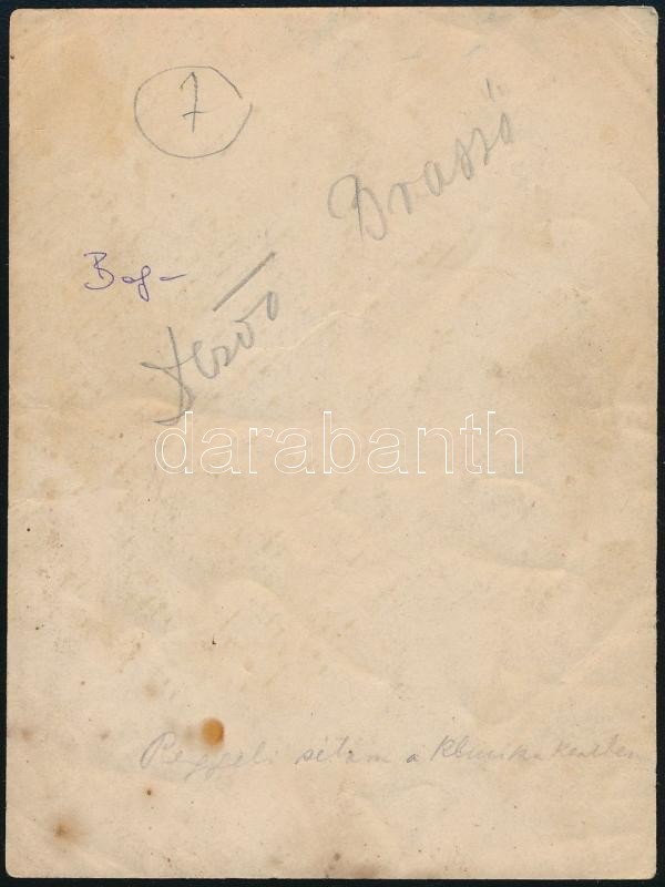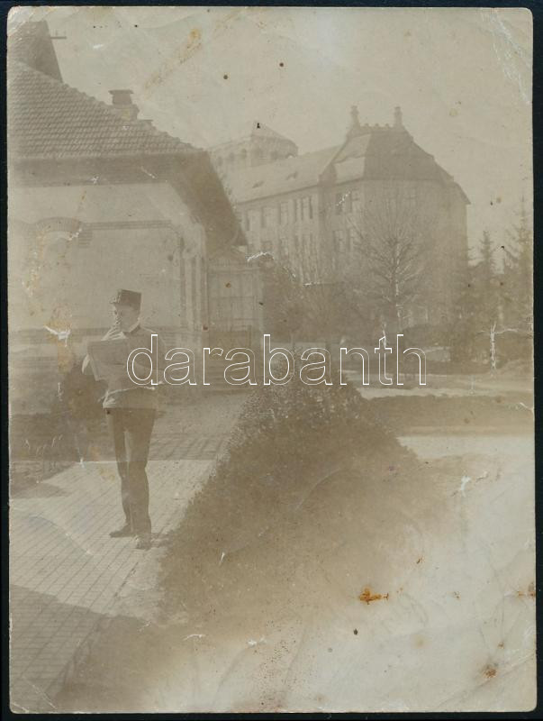 Leírás: 1918 Brassó, Dr. Boga Dezső (1891-?) katonaorvos a klinika kertjében, fotó, hátulján feliratozva, 12×9 cm
