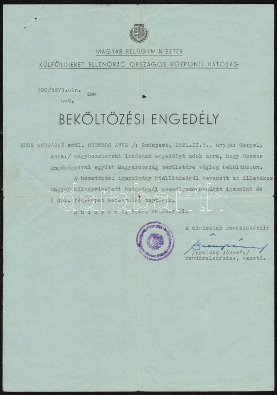 Leírás: 1948 Magyarországi beköltözési engedély és egyéb papírok nagybecskereki lakos részére
