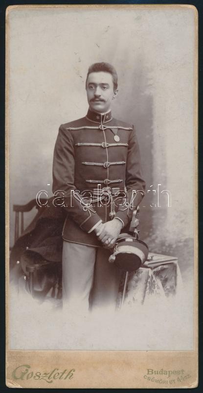 Leírás: cca 1900 Bp., Katona karddal és csákóval, keményhátú fotó Goszleth műterméből, 21xx1 cm