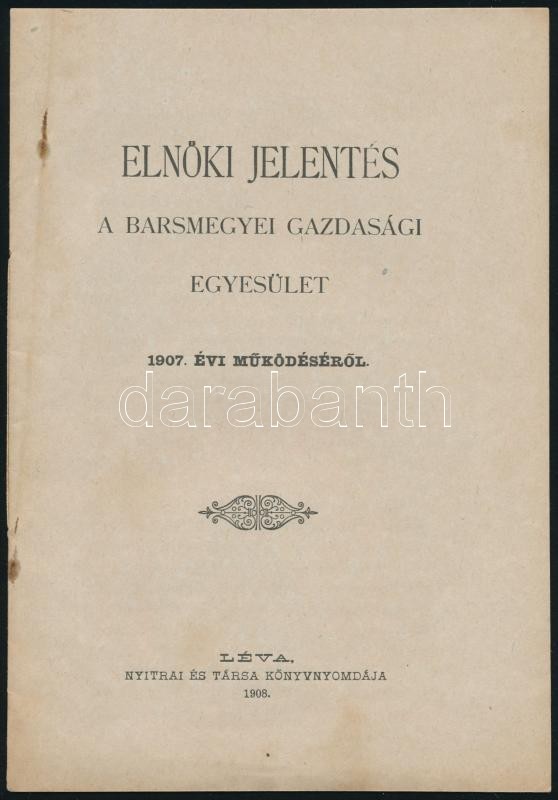 1908 Elnöki jelentés a Barsvármegyei Gazdasági Egyesület működéséről. ... https://www.darabanth.com/hu/292-Gyorsarveres/292.0/Festmeny-mutargy-papirregiseg-egyeb/Nyomtatvanyok~30/1908-Elnoki-jelentes-a-Barsvarmegyei-Gazdasagi-Egyesulet-mukodeserol-Leva-Nyitrai-es-t~II1535526