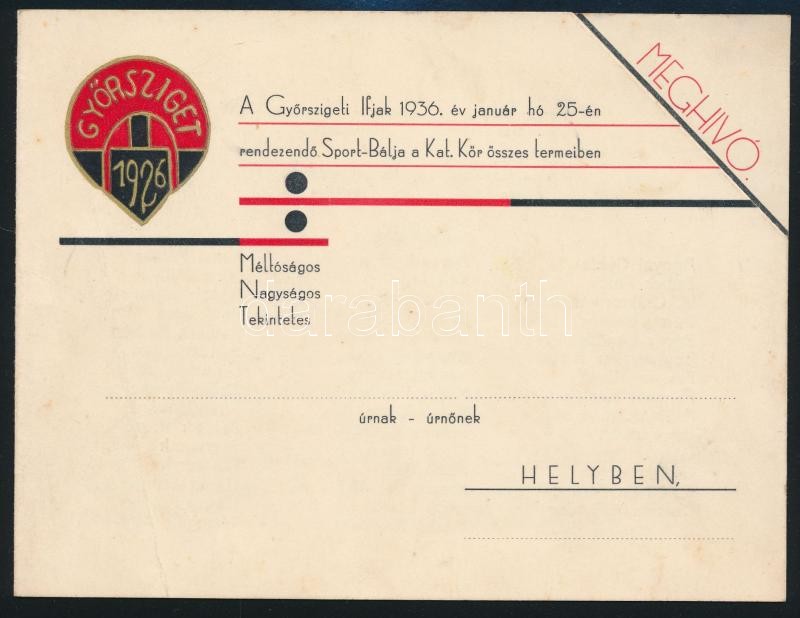 Leírás: 1936 Meghívó a Győrszigeti Ifjak sport- és Társasköre zártkörű sportbáljára