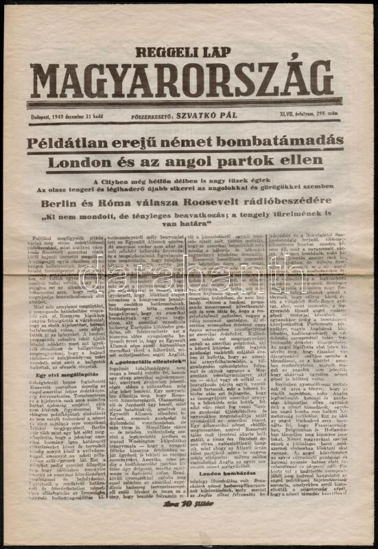 1940 Bp., A Reggeli Lap Magyarország XLVII. évfolyamának 298. száma https://www.darabanth.com/hu/292-Gyorsarveres/292.0/Festmeny-mutargy-papirregiseg-egyeb/Nyomtatvanyok~30/1940-Bp-A-Reggeli-Lap-Magyarorszag-XLVII-evfolyamanak-298-szama~II1545489