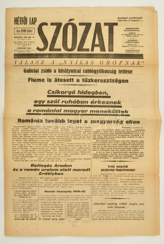1940 Szózat XIV. évfolyam 51. száma, dec. 23., 8 p. https://www.darabanth.com/hu/292-Gyorsarveres/292.0/Festmeny-mutargy-papirregiseg-egyeb/Nyomtatvanyok~30/1940-Szozat-XIV-evfolyam-51-szama-dec-23-8-p~II1544024