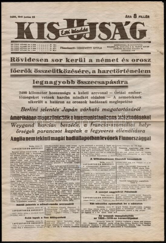 1941. június 23. A Kis Újság Esti Kiadása, benne háborús hírekkel a n... https://www.darabanth.com/hu/292-Gyorsarveres/292.0/Festmeny-mutargy-papirregiseg-egyeb/Nyomtatvanyok~30/1941-junius-23-A-Kis-Ujsag-Esti-Kiadasa-benne-haborus-hirekkel-a-nemet-es-orosz-foero~II1545484