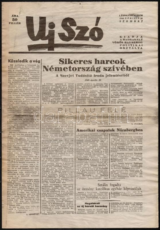 1945 Az Új Szó - kiadja a Vörös Hadsereg Politikai Osztálya - I. évfol... https://www.darabanth.com/hu/292-Gyorsarveres/292.0/Festmeny-mutargy-papirregiseg-egyeb/Nyomtatvanyok~30/1945-Az-Uj-Szo--kiadja-a-Voros-Hadsereg-Politikai-Osztalya--I-evfolyamanak-36-szama~II1545481