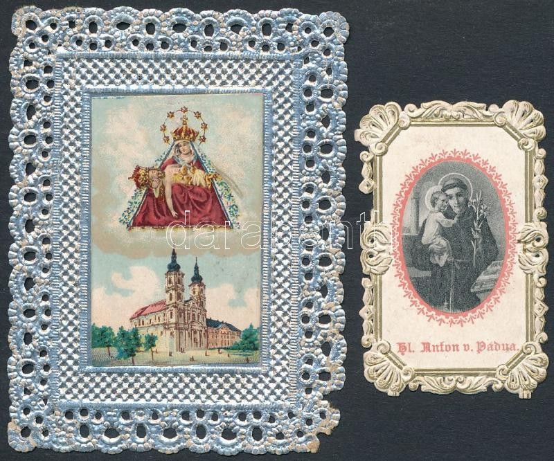 Leírás: 2 db dombornyomott csipke litho szentkép, az egyik ezüst színű, jó állapotban