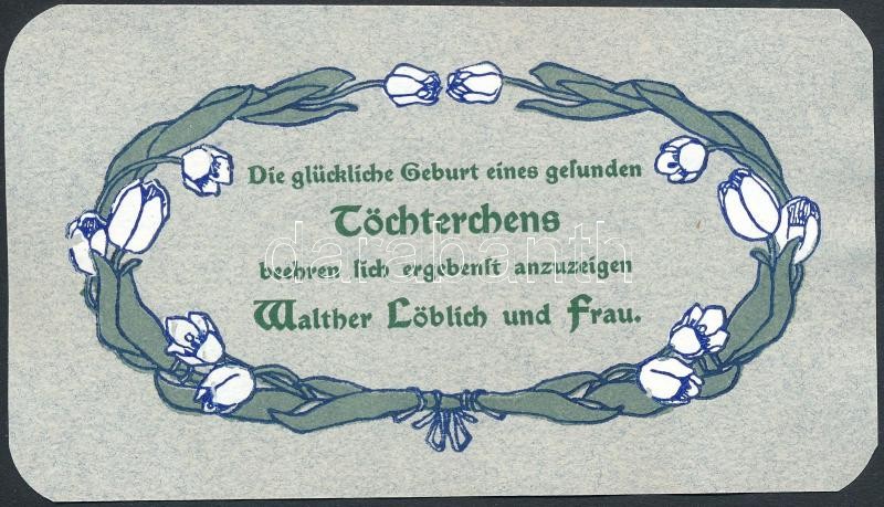 Leírás: cca 1900 Gyermek születését jelentő német nyelvű szecessziós nyomtatvány, 7,5x13 cm