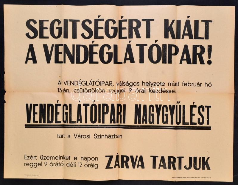 cca 1930-1940 Vendéglátóipari naggyűlés, Merkantil Nyomda, 47x63 cm. https://www.darabanth.com/hu/292-Gyorsarveres/292.0/Festmeny-mutargy-papirregiseg-egyeb/Nyomtatvanyok~30/cca-1930-1940-Vendeglatoipari-naggyules-Merkantil-Nyomda-47x63-cm~II1546315