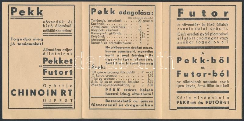 Leírás: cca 1930 Chinoin Rt reklám prospektusa, Pekk és Futor háziállat tápszer