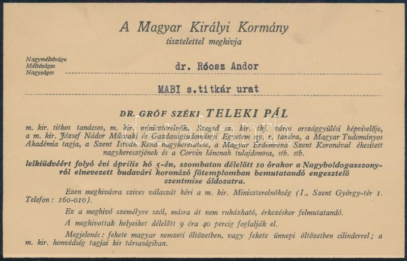 Leírás: cca 1941 A Magyar Királyi Kormány által kiküldött meghívó Gróf Teleki Pál lelki üdvéért mondott misére