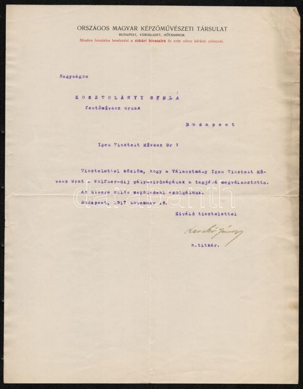 1917 az Országos Magyar Képzőművészeti Társulat levele Kosztolányi-Kann Gyula (1868-1945) festő részére a Wolfner-díj pályabíróságának tagjává választásáról