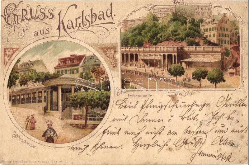 Leírás: Karlovy Vary, Karlsbad; Felsenquelle, Schlossbrunnen / fountains, Friedrich Kirchner Kunstanstalt Art Nouveau litho (cut)