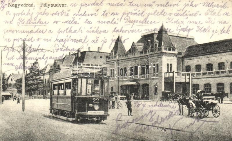 Leírás: Nagyvárad, Oradea; vasútállomás, 22-es sorszámú villamos / railway station, tram (Rb)