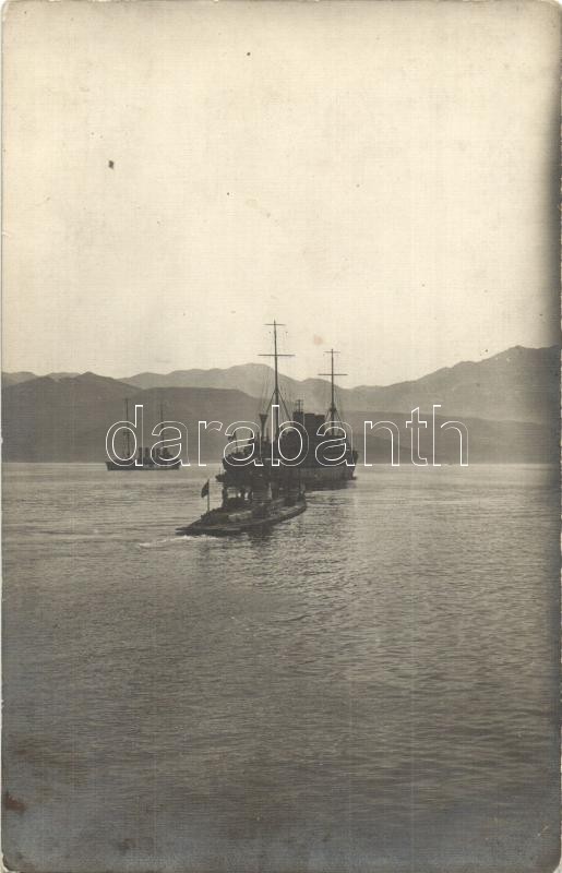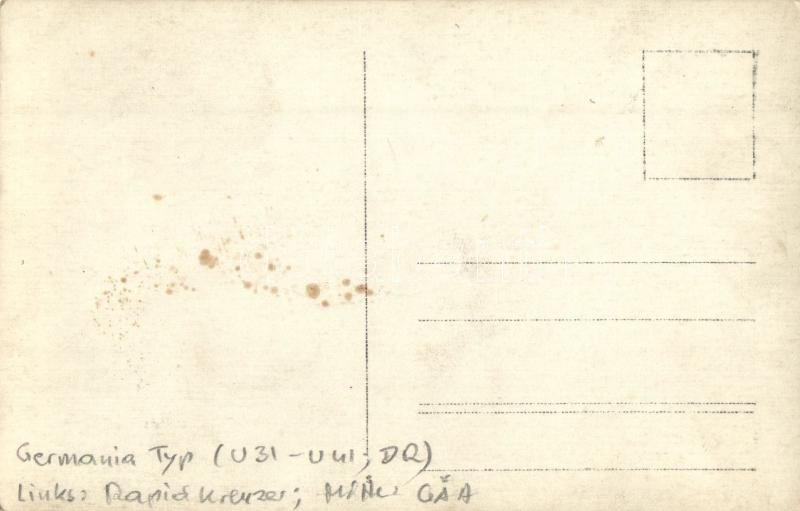 Német típusú U-31 és U-41-es tengeralattjárók az SMS Gäa/Gaea előtt, balra gyorscirkáló / Germania Typ Unterseeboot 31 und 41. K.u.K. Kriegsmarine, SMS Gäa/Gaea, Rapidkreuzer, photo (fl)