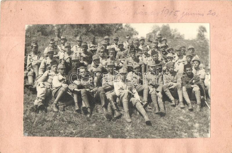 1915 Első világháborús tábori posta képeslap, beragasztott fotóval, K.u.K. és bosnyák katonák csoportképe a déli frontról / WWI military field post with glued photo, K.u.K. and Bosnian soldiers group picture, '5/7 Pionierkompagnie' (EK)