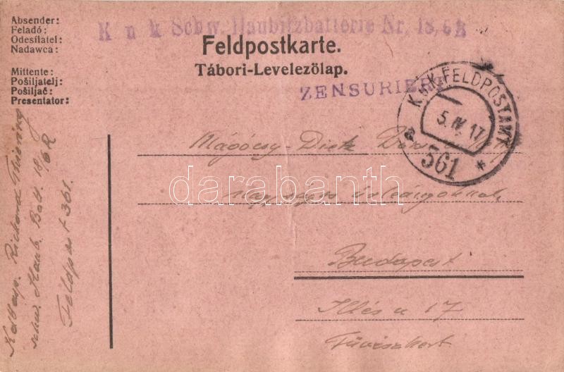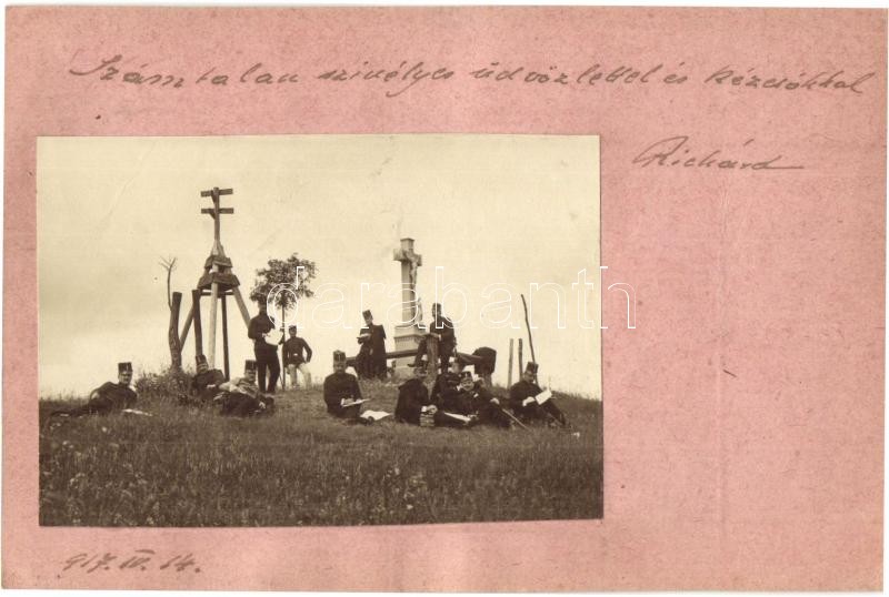 1917 Első világháborús tábori posta képeslap, beragasztott fotóval, feszület mellett olvasó K.u.K. katonák csoportképe / WWI military field post with glued photo, K.u.K. soldiers reading by a cross, 'K.u.K. Schw. Haubitzbatterie Nr. 18/6R' (EK)