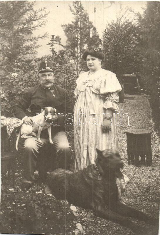 Leírás: K.u.K. military officer with his wife and his dogs from Mostar, Atelie M. Savic photo (cut)