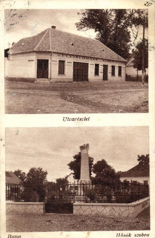 Bana, utcarészlet, hősök szobra, vendéglő, Özv. Fleischmann Adolfné üz... https://www.darabanth.com/hu/292-Gyorsarveres/292.0/Kepeslapok/Magyarorszag~300005/Bana-utcareszlet-hosok-szobra-vendeglo-Ozv-Fleischmann-Adolfne-uzlete-es-sajat-kiada~II1548902