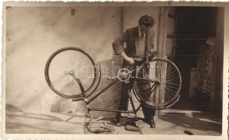 Kerékpárszerelő férfi / Bicycle Mechanic man, photo https://www.darabanth.com/hu/292-Gyorsarveres/292.0/Kepeslapok/Sport~300081/Kerekparszerelo-ferfi-Bicycle-Mechanic-man-photo~II1547380