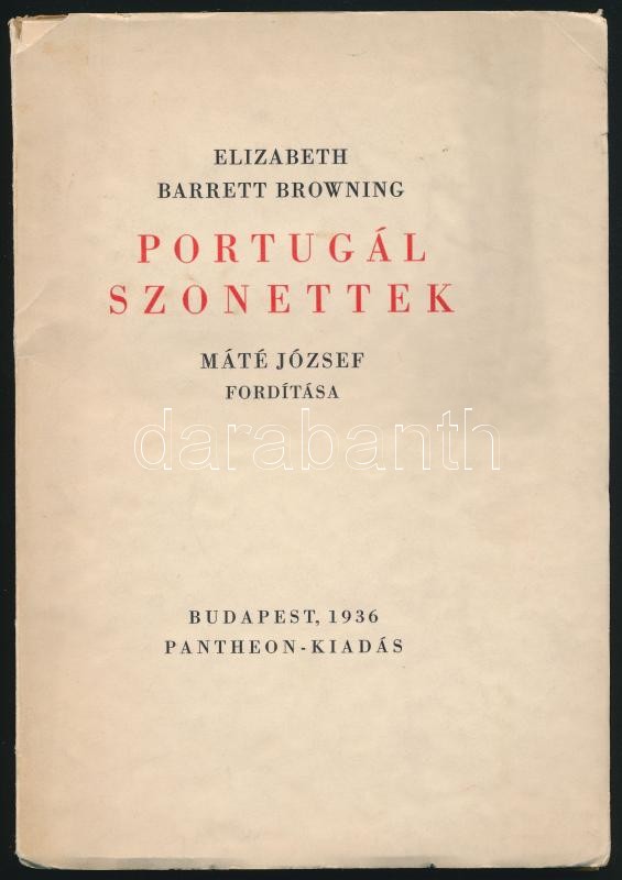 Browning, Elizabeth Barrett: Portugál szonettek. Bp., 1936, Pantheon K... https://www.darabanth.com/hu/292-Gyorsarveres/292.0/Konyvek/Konyvek-Egyeb~200007/Browning-Elizabeth-Barrett-Portugal-szonettek-Bp-1936-Pantheon-Kiadas-Kiadoi-papirkotes~II1545571