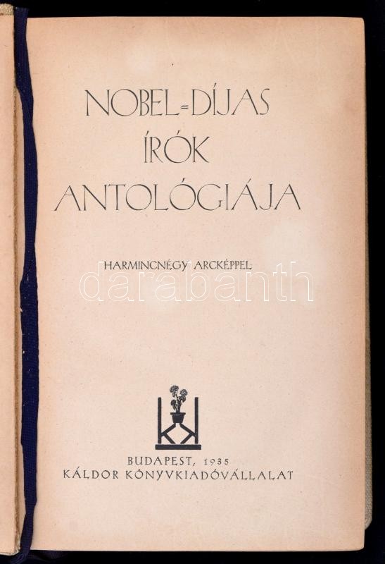 Nobel-díjas írók antológiája. Bp., 1935, Káldor. Kiadói egészvászon-kötés, kissé foltos borítóval, ceruzás aláhúzásokkal, a tartalomjegyzéknél az írók származása ceruzával bejegyezve, az írók fekete-fehér fotóival, ex libris-szel.