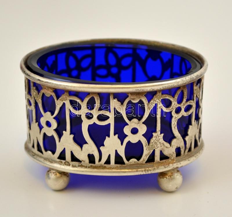 Leírás: Angol áttört ezüst fűszertartó üvegbetéttel. Jelzett, hibátlan. / English silver spice holder. 5x3,5 cm