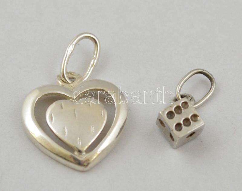 Leírás: Ezüst(Ag) szív és kocka alakú függő, jelzéssel és jelzés nélkül, 2 db, nettó: 1,6 g