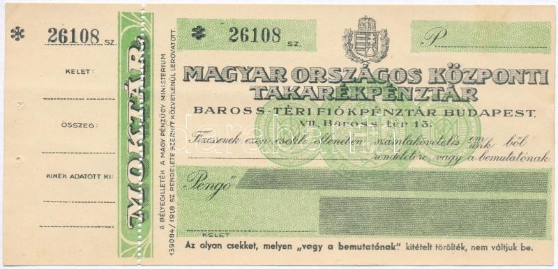 Leírás: Budapest 1926-1945. "Magyar Országos Központi Takarékpénztár - Baross téri Fiókpénztár" kitöltetlen csekk T:I-