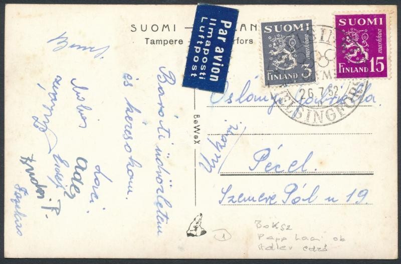 1952 Az ökölvívó csapat (Papp Laci olimpiai bajnok, Erdei János, és Adler Zsigmond szövetségi kapitány és edző ..stb.) üdvözlő sorai a Helsinki olimpiáról küldött képeslapon.
