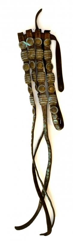 Leírás: Régi réz díszek (közte hordó mintájú) bőrre erősítve, 90×20 cm