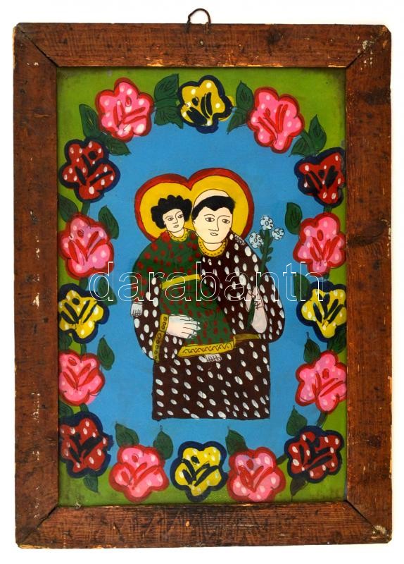 Leírás: Jelzés nélkül: Erdélyi festett üveg ikon, fa keretben, 39×29,5 cm