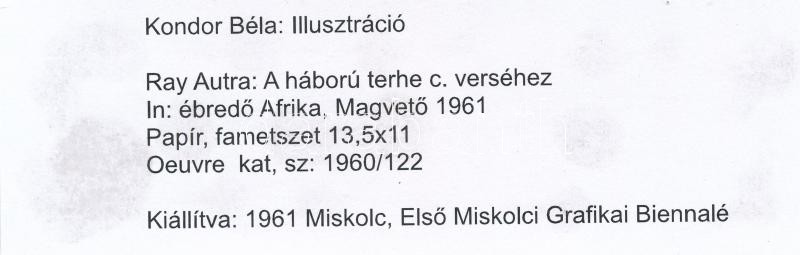 Kondor Béla (1931-1972): Ébredő Afrika. Fametszet, paszpartuban, hátol... https://www.darabanth.com/hu/293-Gyorsarveres/293.0/Festmeny-mutargy-papirregiseg-egyeb/Festmenyek-es-grafikak~200001/Kondor-Bela-1931-1972-Ebredo-Afrika-Fametszet-paszpartuban-hatoldalon-feliratozva-14x12-c~II1553471