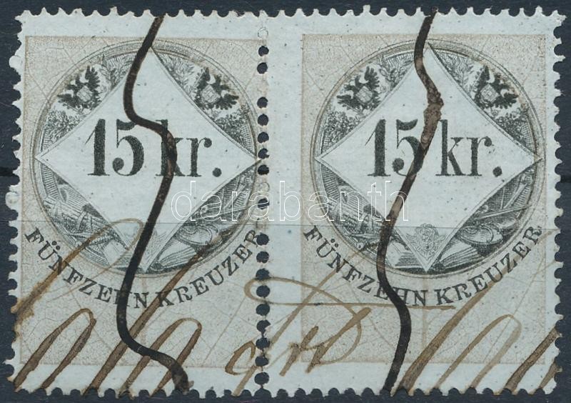 Leírás: 15kr okmánybélyeg pár látványos elfogazással