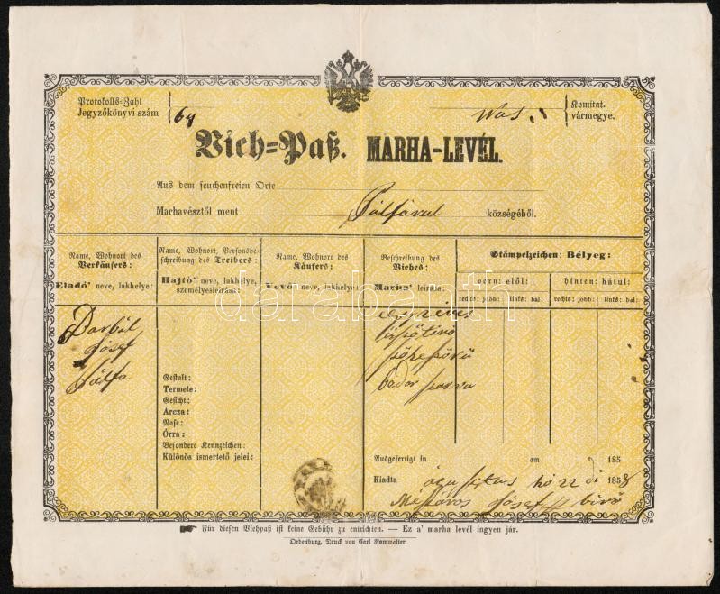 1858 Pálfalva magyar és német nyelvű marhalevél https://www.darabanth.com/hu/293-Gyorsarveres/293.0/Festmeny-mutargy-papirregiseg-egyeb/Okmanyok~200017/1858-Palfalva-magyar-es-nemet-nyelvu-marhalevel~II1555717