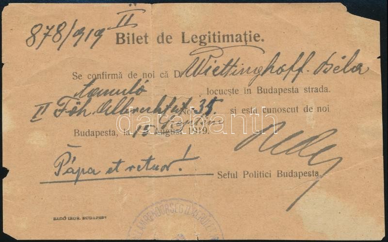Leírás: 1919 Budapest román megszállás.utazási igazolvány megviselt állapotban
