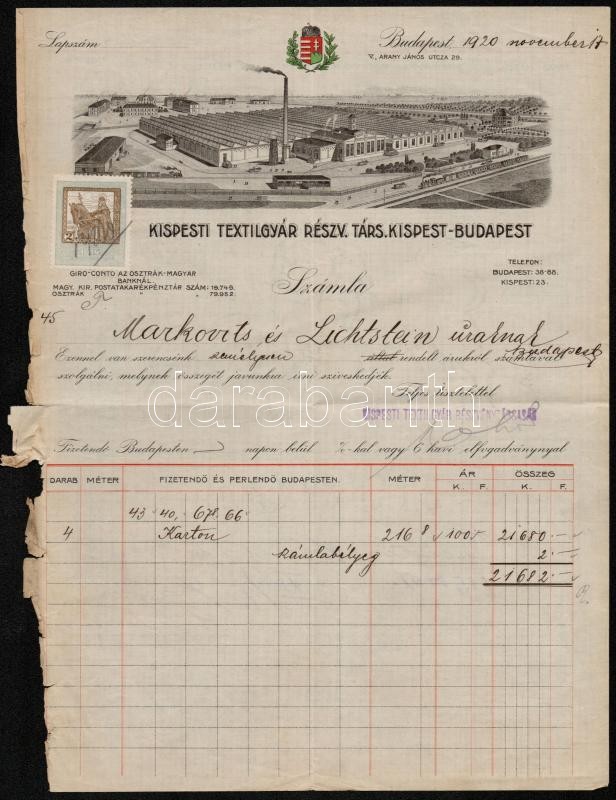 1920 Kispesti Textilgyár Rt. díszes fejléces számlája, okmánybélyeggel... https://www.darabanth.com/hu/293-Gyorsarveres/293.0/Festmeny-mutargy-papirregiseg-egyeb/Okmanyok~200017/1920-Kispesti-Textilgyar-Rt-diszes-fejleces-szamlaja-okmanybelyeggel-29x21-cm~II1554362
