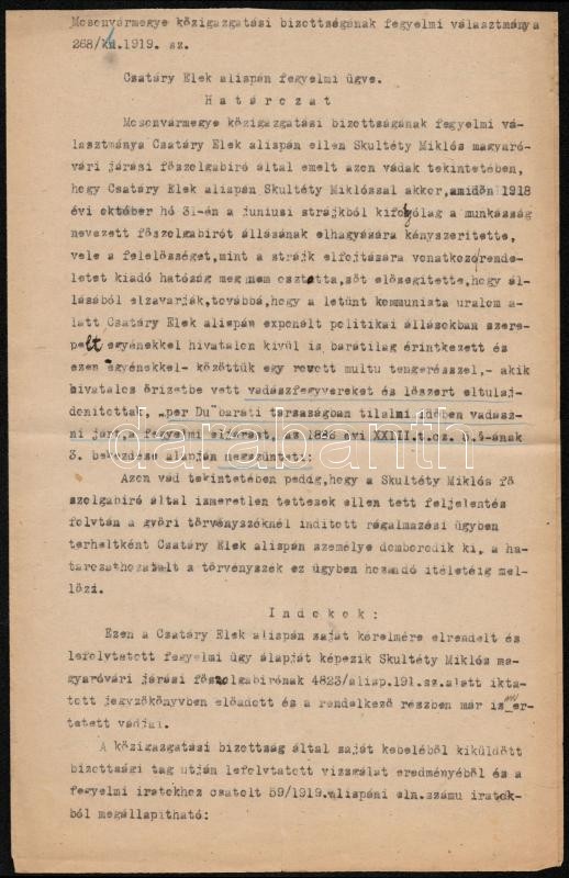 Leírás: 1921 Magyaróvár, Moson vármegye közigazgatási bizottságának fegyelmi választmánya által kiadott határozat Csatáry Elek alispán fegyelmi ügyében