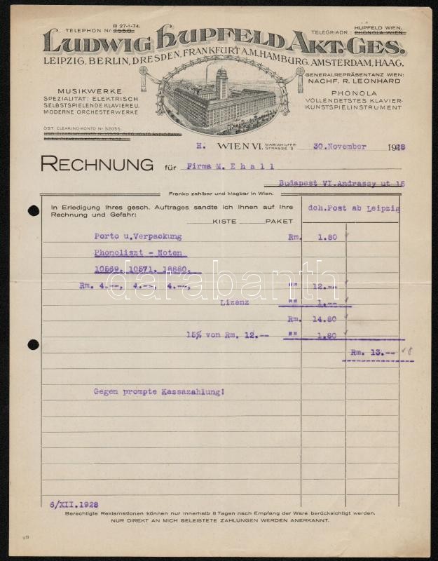 Leírás: 1928 Bécs, Ludwig Hupfeld hangszergyár díszes fejléces számlája, 29x22 cm / Decorative invoice of the Wien-based company, instrument factory