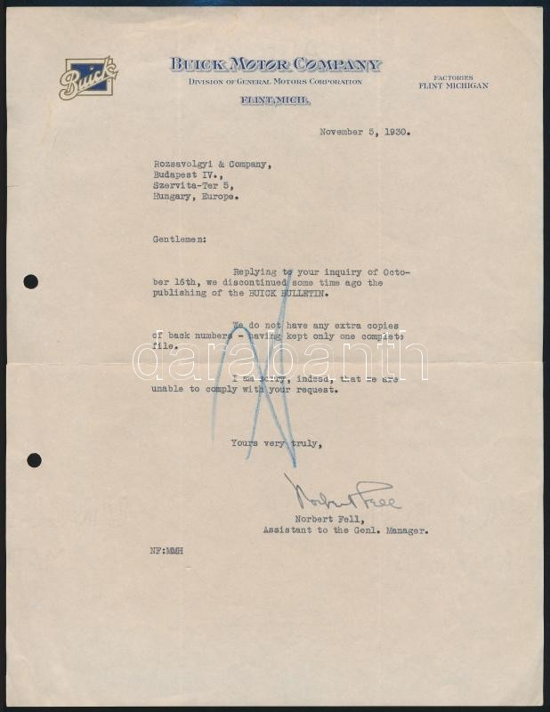 1930 Flint, Michigan, Buick autógyár díszes fejléces levele, Budapestr... https://www.darabanth.com/hu/293-Gyorsarveres/293.0/Festmeny-mutargy-papirregiseg-egyeb/Okmanyok~200017/1930-Flint-Michigan-Buick-autogyar-diszes-fejleces-levele-Budapestre-kuldve-27x21-cm-Decor~II1551270