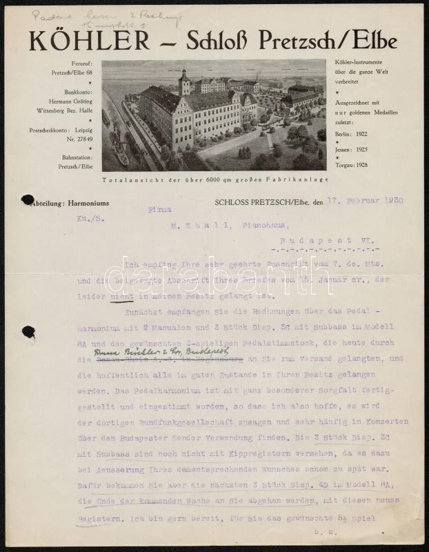 1930 Pretzsch/Elbe, Köhler hangszergyár díszes fejléces számlája, 29x2... https://www.darabanth.com/hu/293-Gyorsarveres/293.0/Festmeny-mutargy-papirregiseg-egyeb/Okmanyok~200017/1930-PretzschElbe-Kohler-hangszergyar-diszes-fejleces-szamlaja-29x22-5-cm~II1551108